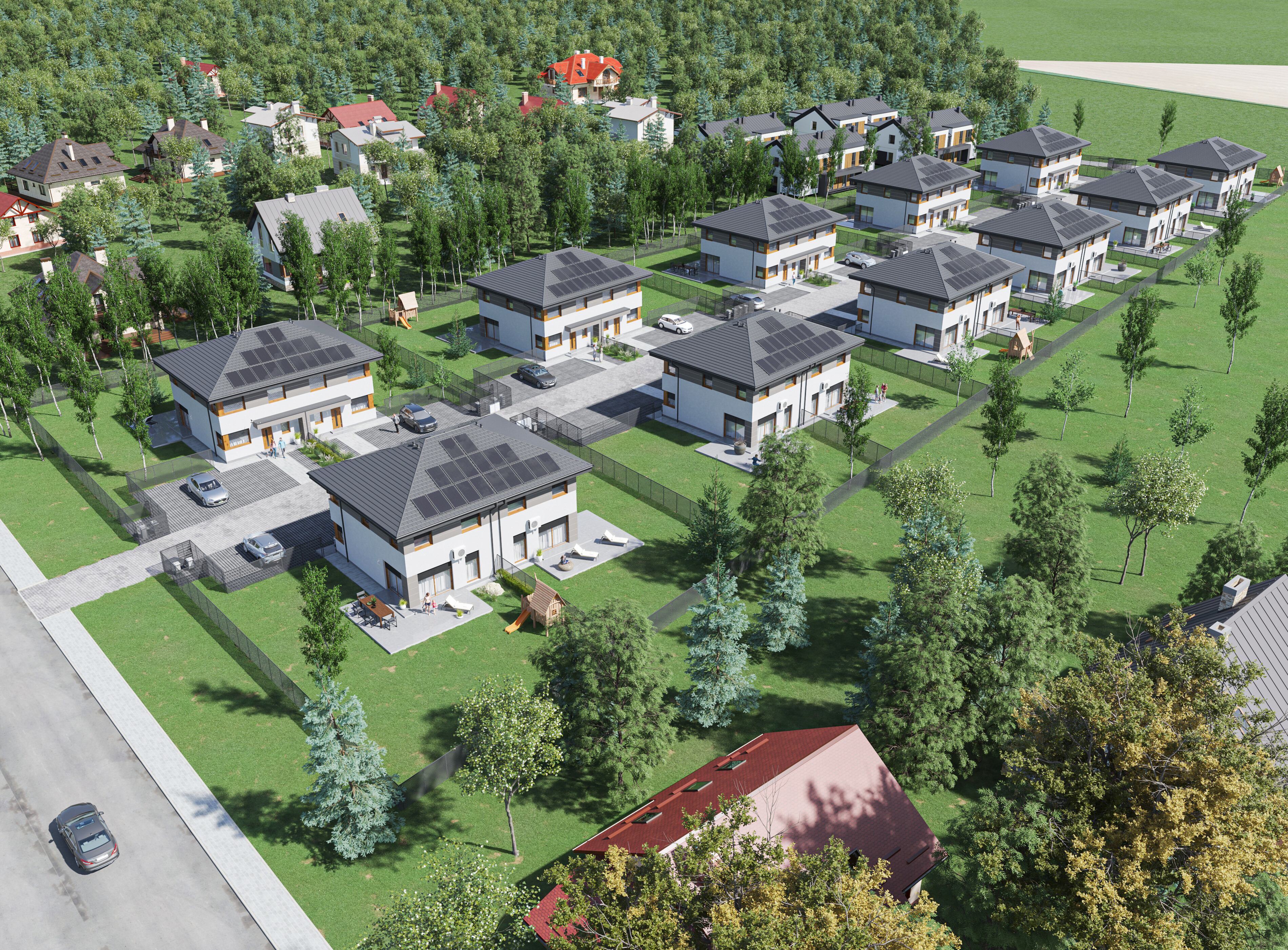 Całość osiedla zapewnia prywatność dzięki oświetlonej, zamkniętej drodze dostępnej tylko dla mieszkańców.